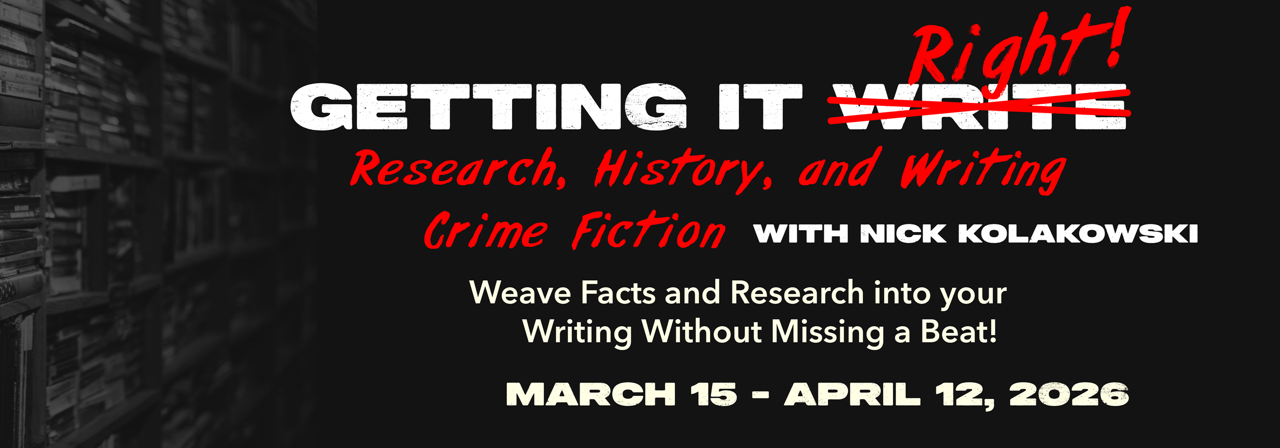 Titled “Getting it Right: Research, History, and Writing Crime Fiction,” participants will learn how to make the past come alive, how to integrate accurate details without hurting a story’s pace and flow, and how to effectively utilize sources. If you’ve ever wanted to use facts and history as tools in your writing without slowing it down with info-dumps, this course is for you.